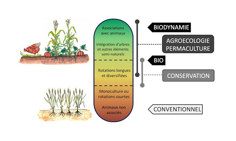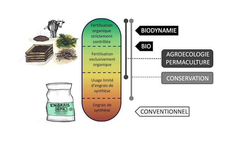 D’autres sont gouvernées non pas par un cahier des charges, mais par des principes fondamentaux reconnus par les agriculteurs. On peut citer ici la permaculture, l’agriculture de conservation et l’agroécologie, qui ont des règles parfois très différentes notamment concernant le recours aux pesticides, la fertilisation ou le travail du sol, comme on le verra ci-dessous.