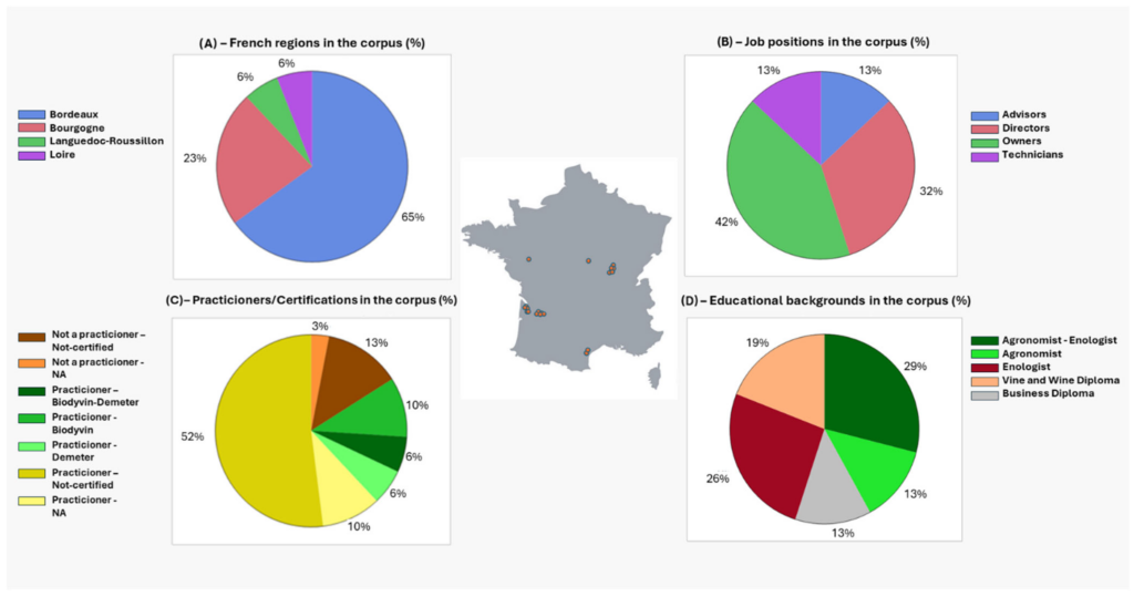 Afin d’obtenir un éventail de perspectives contrastées, nous avons constitué un panel varié de 30 personnes représentant différentes régions viticoles, dont Bordeaux (65 %), la Bourgogne (23 %), la Loire (6 %) et le Languedoc-Roussillon (6 %). Le panel était composé de 42% de propriétaires, 32% de directeurs, 13% de techniciens et 13% de conseillers. Majoritairement masculines (83%), les personnes interrogées avaient des formations diverses, avec 42% d’agronomes et 39% d’œnologues. Notamment, 84 % d’entre elles pratiquaient la biodynamie, mais seulement 22 % étaient certifiées.