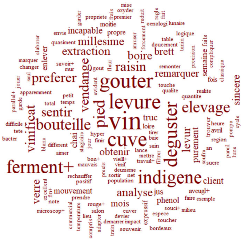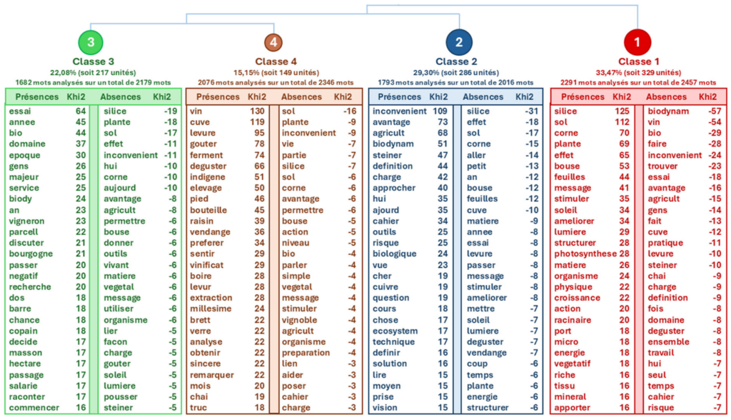 La classe 4 est centrée sur les lexèmes liés au vin et aux expériences sensorielles, tels que « raisin », « vendange », « goût » et « vieillissement ». Cette classe met l’accent sur les aspects sensoriels et qualitatifs de la production de vin. Dans cette classe, les praticiens certifiés et non certifiés sont représentés, avec une curiosité notable pour l’influence de la biodynamie sur la qualité du vin.