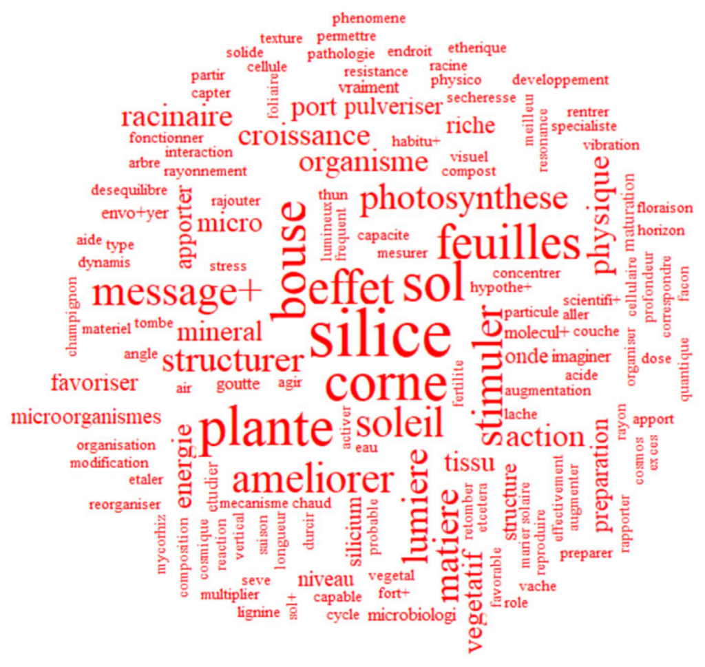 Les lexèmes dominants de la classe 1 comprennent entre autres « silice », « sol », « corne », « plante », « effet » et « croissance ». Cette classe se compose essentiellement de noms et de verbes d’action, qui mettent l’accent sur les effets physiques des préparations biodynamiques. La représentation de la biodynamie dans ce contexte est matérialiste, suggérant que les pratiques biodynamiques produisent des résultats visibles et mesurables dans l’agriculture. Cette perspective s’éloigne des fondements spirituels initiaux de Steiner, en présentant la biodynamie davantage comme une méthode agricole que comme une pratique spirituelle. Les membres de la classe 1 sont principalement des praticiens de la biodynamie, certifiés ou non, avec une forte proportion d’agronomes (60 %).